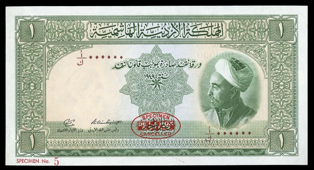 Jordan. The Hashemite Kingdom of the Jordan. Currency Board. 1 Dinar. Law of 1949. First Issue. P-2s2. Specimen. No. A/K 000000-5. Green. Signed Sulaiman al Nabulsi, Yusuf Haikal. King `Abd Allah at right; Forum columns at Jerash on back. Red TDLR Specimen oval bottom center. Crisp Uncirculated.