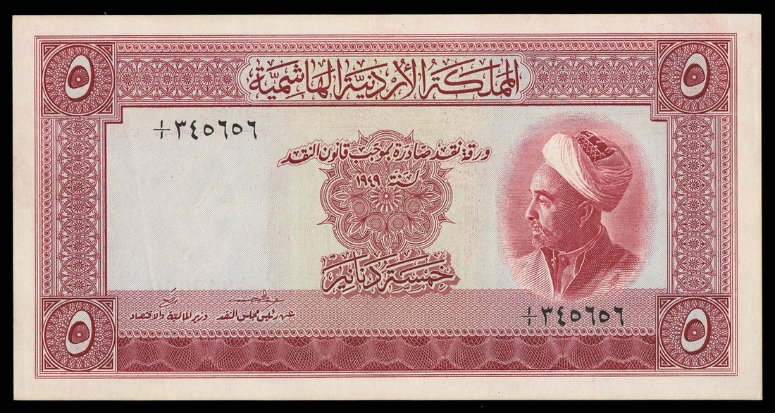 Jordan. The Hashemite Kingdom of the Jordan. Currency Board. 5 Dinars. Law of 1949. First Issue. P-3a. No. A/A 345656. Red. King `Abd Allah at right; al-Khazneh - the Treasury of Petra on back. Uncirculated. Fresh and new.