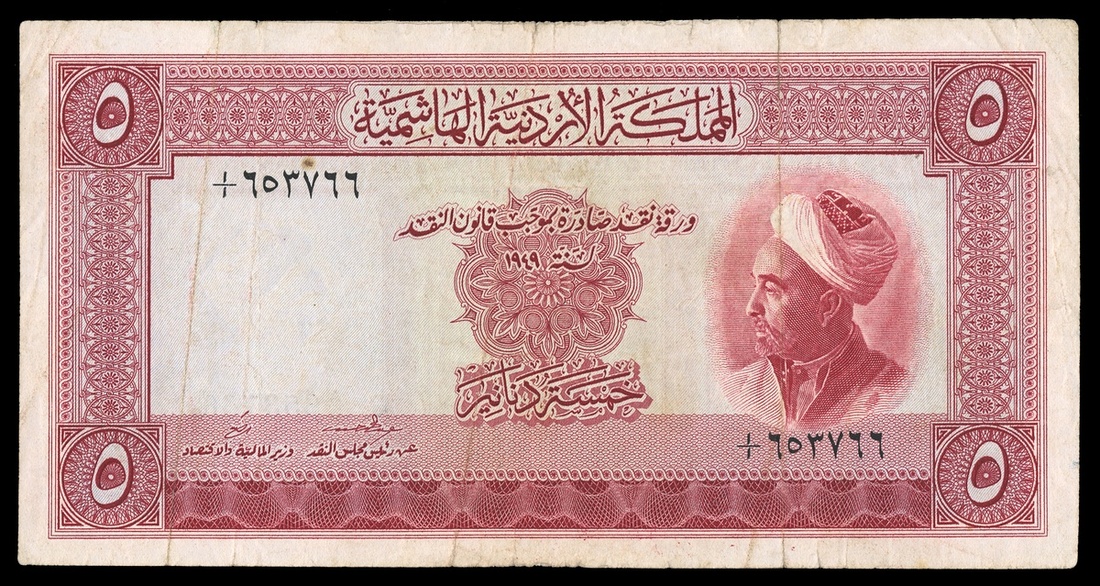 Jordan. The Hashemite Kingdom of the Jordan. 5 Dinars. Law of 1949. P-3a. No. A/A 653766. Red. King `Abdullah at right; al-Khazneh of Petra on back. Small tear top edge, Fine.