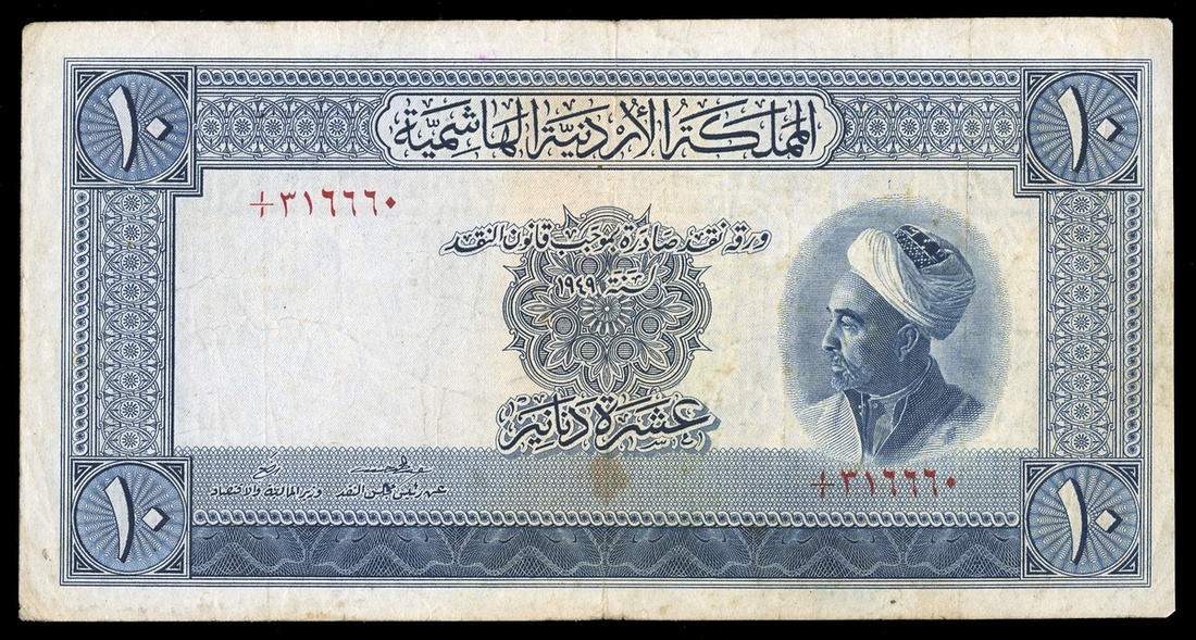 Jordan. The Hashemite Kingdom of the Jordan. 10 Dinars. Law of 1949. P-4a. Blue. No. A/A 316660. King `Abdullah at right; al-Khazneh of Petra on back. Small stain on front. VF.