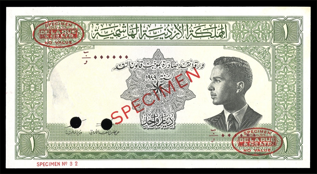 Jordan. Currency Board. 1 Dinar. Law of 1949 (1952 Issue). P-6as. Specimen. No. B/F 000000. Green and black. A young King Hussein at right; Forum columns at Jerash on back. Red De La Rue ovals top left bottom right, diagonal red SPECIMEN, two single punch cancels. Small surface loss near back watermark from mounting. Otherwise Uncirculated.