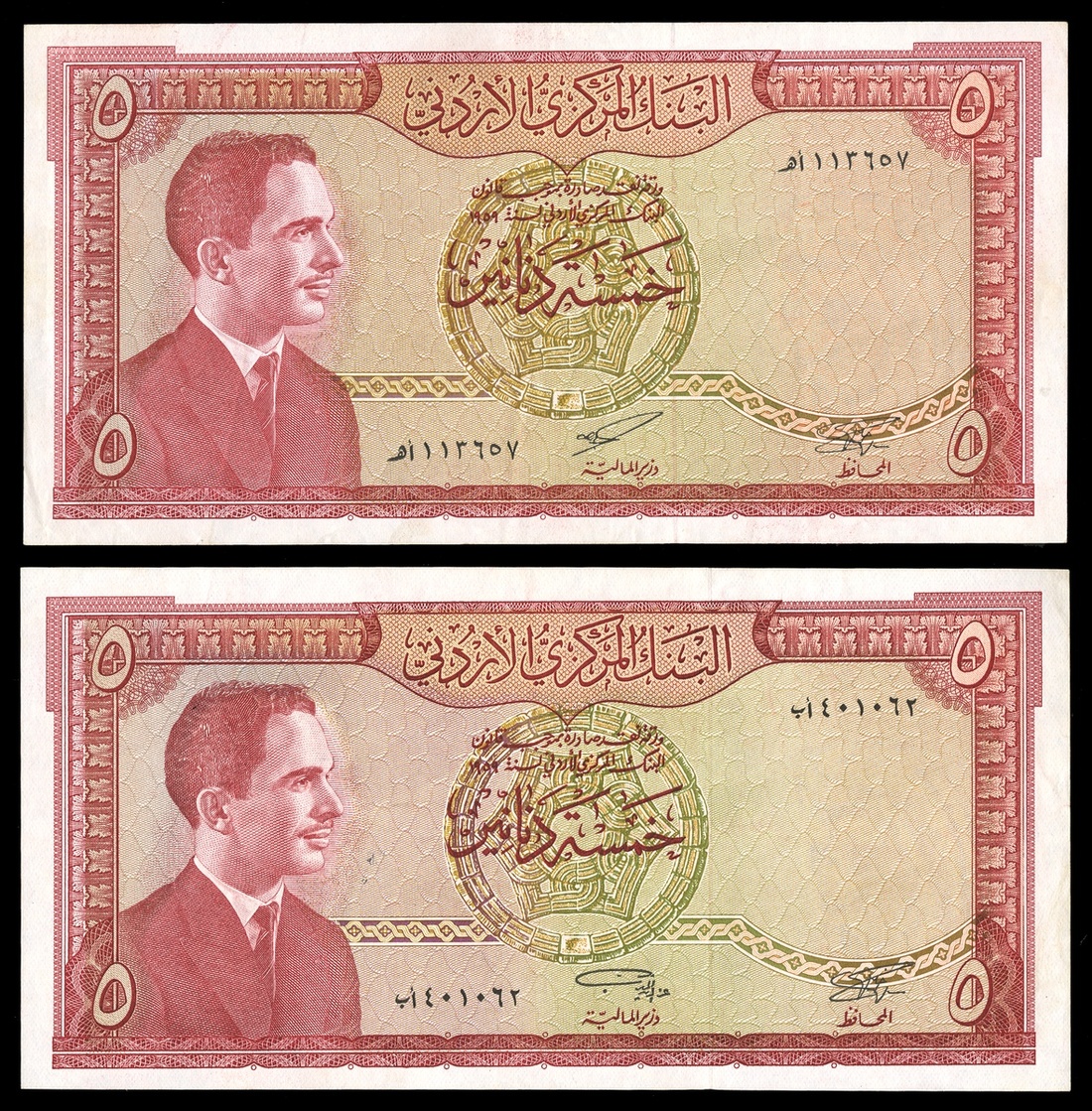 Jordan. Central Bank. Pair of 5 Dinars. Law of 1959. First issue. P-11a, b. Signature varieties. Red and olive-green. Signed Ez-Eldin al Mufti; `Abd al-Wahab al Majali. King Hussein at left, law date top center; al-Khazneh - the Treasury at Petra on back. EF-AU. [2]