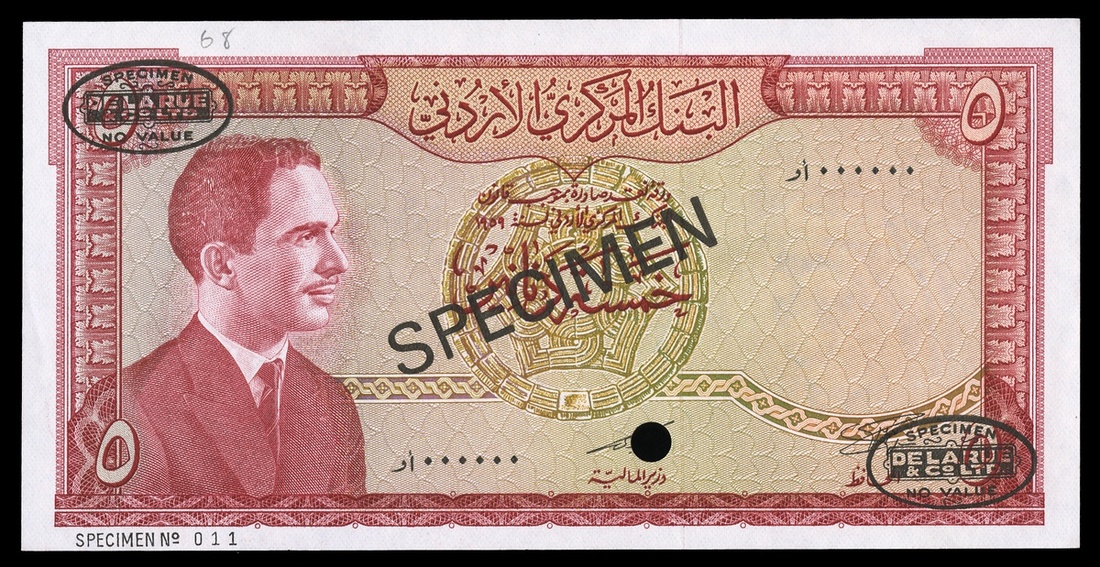 Jordan. Central Bank. 5 Dinars. Law of 1959. First issue. P-11cs. Specimen. No. D/I 000000-011. Signed Hashim al Jayoosi. King Hussein at left, law date top center; al-Khazneh - the Treasury at Petra on back. Black DLR oval top left bottom right, diagonal black SPECIMEN, single punch cancel. Ink annotation top left margin. Uncirculated.