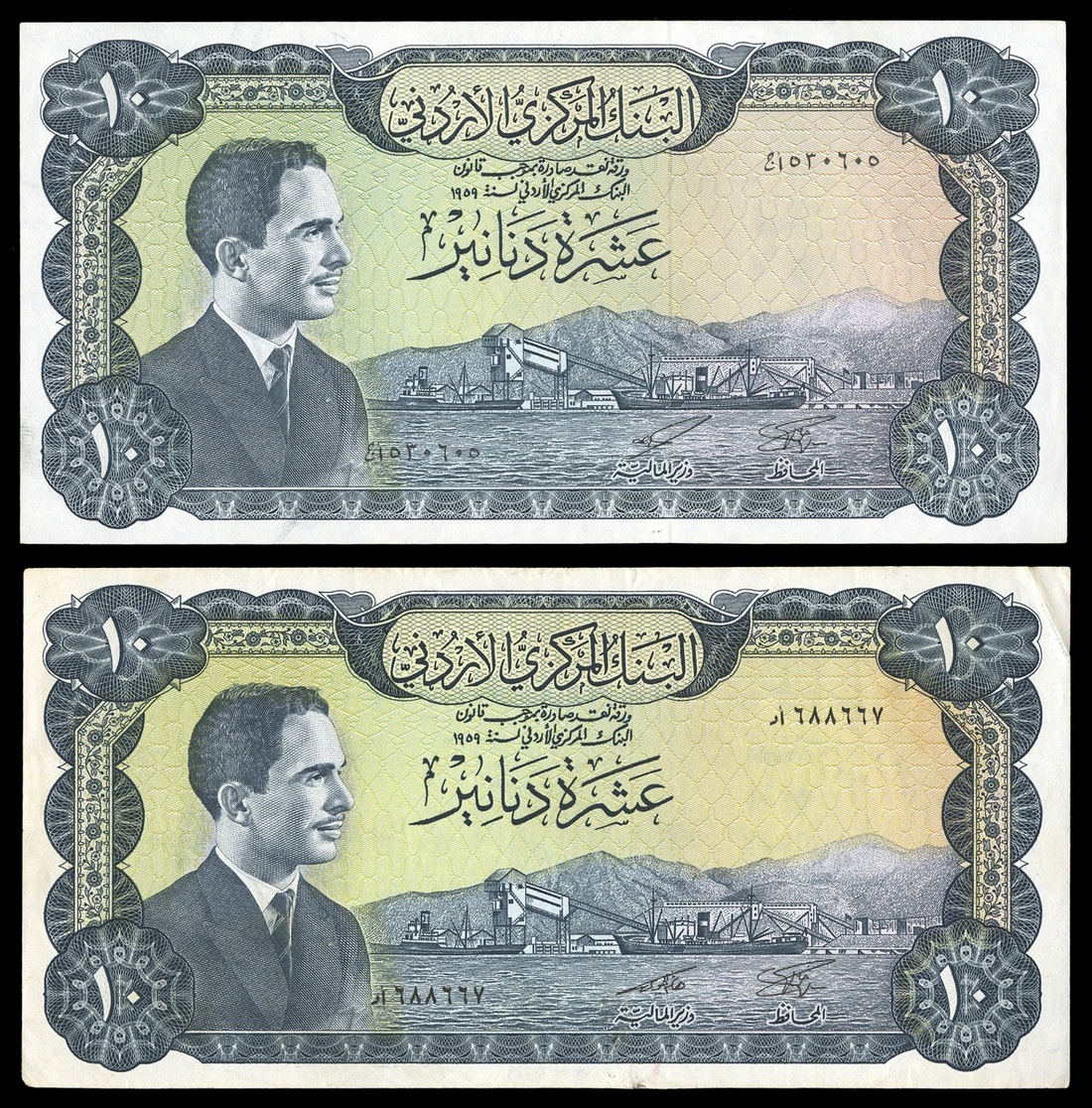 Jordan. Central Bank. Pair of 10 Dinars. Law of 1959. P-12b, c. Signature varieties. Blue-gray. Signed `Abd al-Wahab al Majali; Hashim al Jayoosi. King Hussein at left, law date at center, ships at Aqaba port and mountains; Baptismal site on the River Jordan on back. AU and EF with corner fold. [2]