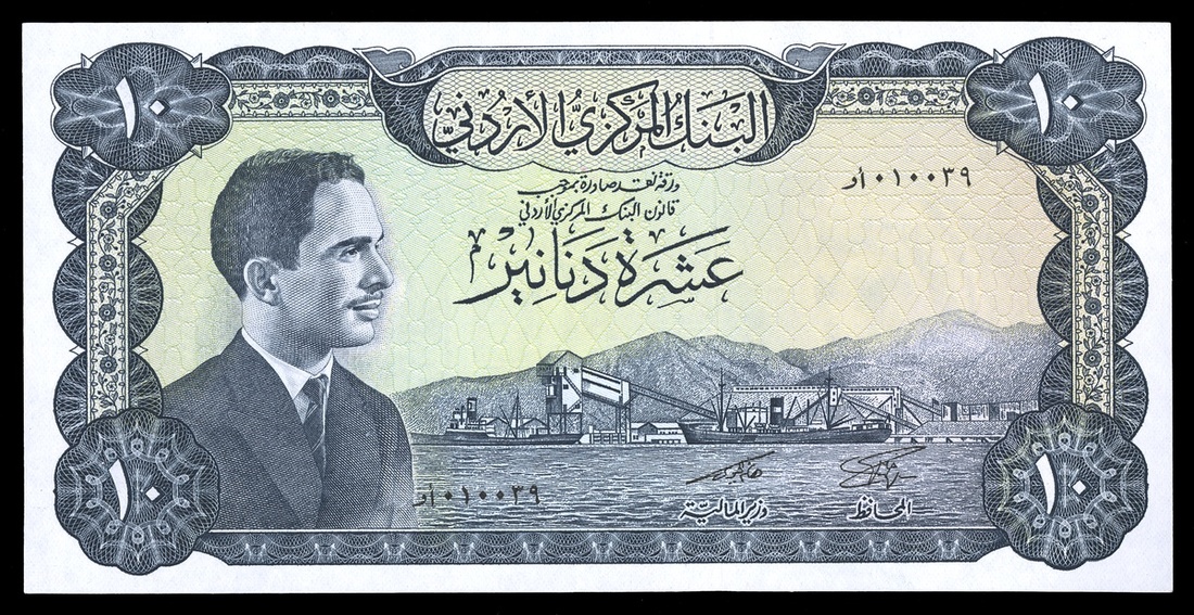 Jordan. Central Bank of Jordan, 10 Dinars. Law of 1959 (1965). P-12c. Blue-gray on pale green, yellow. King Hussein at left, Cargo port at center; Baptismal site River Jordan on back. Crisp Uncirculated.