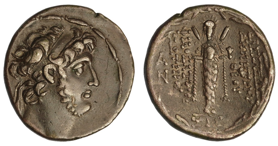 Seleukid Kings of Syria. Demetrios III Eukairos (97/7-88/7 BC). AR Tetradrachm, dated SE 217 (96/5 BC). Damaskos. 16.17 gms. Diademed head right in filleted border, rev. Cult statue of Atargatis standing facing, arms outstretched, holding flower, barley stalk arising from each shoulder, A/N outer left, date ZI? below, all within wreath. SC 2450.3, HGC 9, 1305. Deep battleship gray over small old obverse scratch. Very Fine.