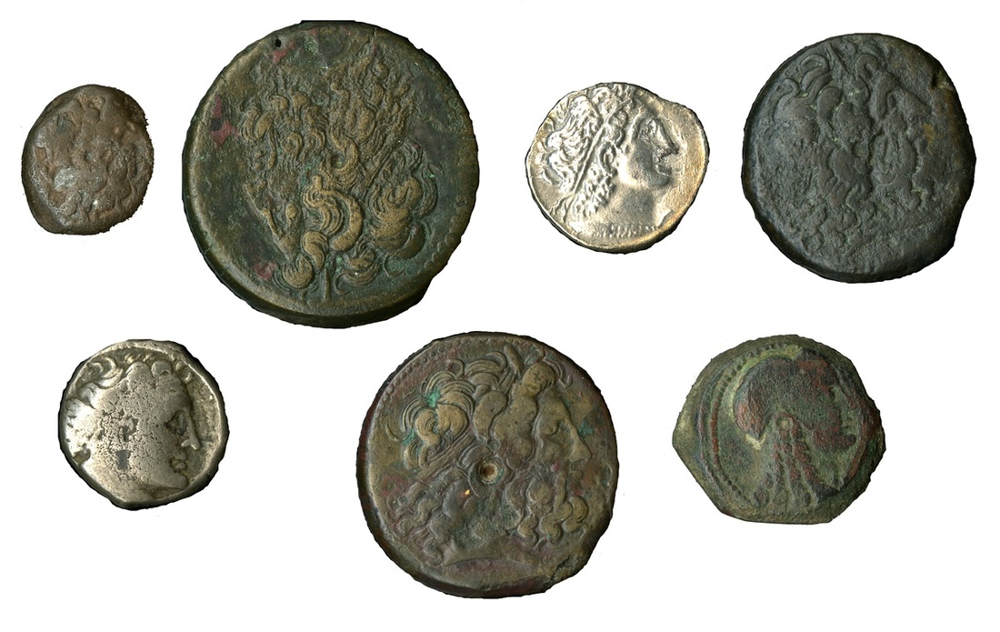Kings of Egypt. Ptolemaic Study Group. Includes AR Tetradrachm of Ptolemy XII and Kleopatra VII, large Zeus-Ammon /eagle type AEs - 43, 39 and 35mm and a small AE; also what appears to be a sandcast of a Isis/eagle type AE. Fine-About EF. (7)