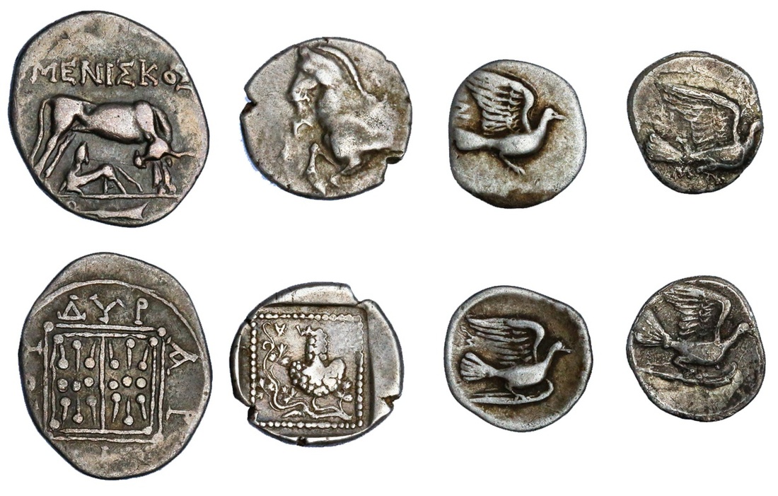 A quartet of Greek Silver Fractions. Includes: Maroneia. Drachm, 398/7-386/5 BC. Forepart of horse left/Grapes on vine. Fourth century BC Obols (2) of Sikyon - dove flying right; and a Drachm of Dyrrhachion. About VF-VF. (4)
