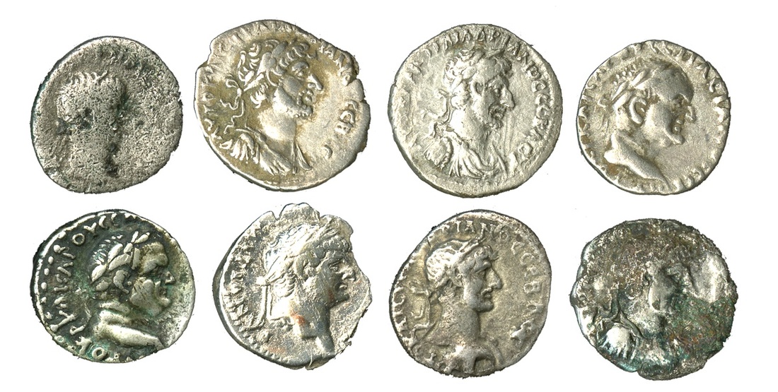 Roman Provincial. Lot of AR Hemidrachm of Caesarea in Cappadocia. Includes issues of Nero. Nike seated right. Porous; Vespasian (2). Nike left reverses; and Hadrian (4). All year 4 (120/1). Nike advancing right. one somewhat grainy, one porous with heavy deposits. The Nero VG, the others VF; also Roman AR Quinarius of Domitian. Victory right. Cracked edge, VF. (8)