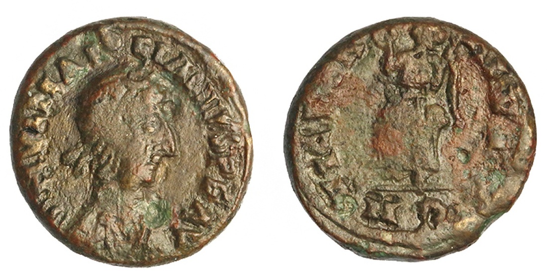 Roman Imperial. Western Empire. Majorian (457-461). AE, 14mm. Mediolanum (Milan). 2.12 gms. DN IVL MAIORIANVS PF AV, pearl-diademed, draped and cuirassed bust right, rev. Victory advancing left, holding wreath and palm frond, MD in ex. RIC 2645, LRBC 582. Rare. With Avitus' deposition in October 456, Majorian and Master of Soldiers Ricimer, the king-maker, became defacto rulers in the West. On April 1, 457, Majorian was hailed Emperor of the West and officially installed December 28. After dealing with the Visigoths and Burgundians in Gaul, Majorian turned to face the Vandals. In 460, he had assembled a fleet of about 300 warships in Spain; but through treachery the entire fleet was captured by the Vandals and the Romans had to agree to humiliating peace terms. Majorian returned to Rome to find his popularity destroyed and Ricimer an enemy. He abdicated and was executed (or allowed to take his own life) on August 7, 461. Olive-green with burgundy earthen hues. Very Fine.