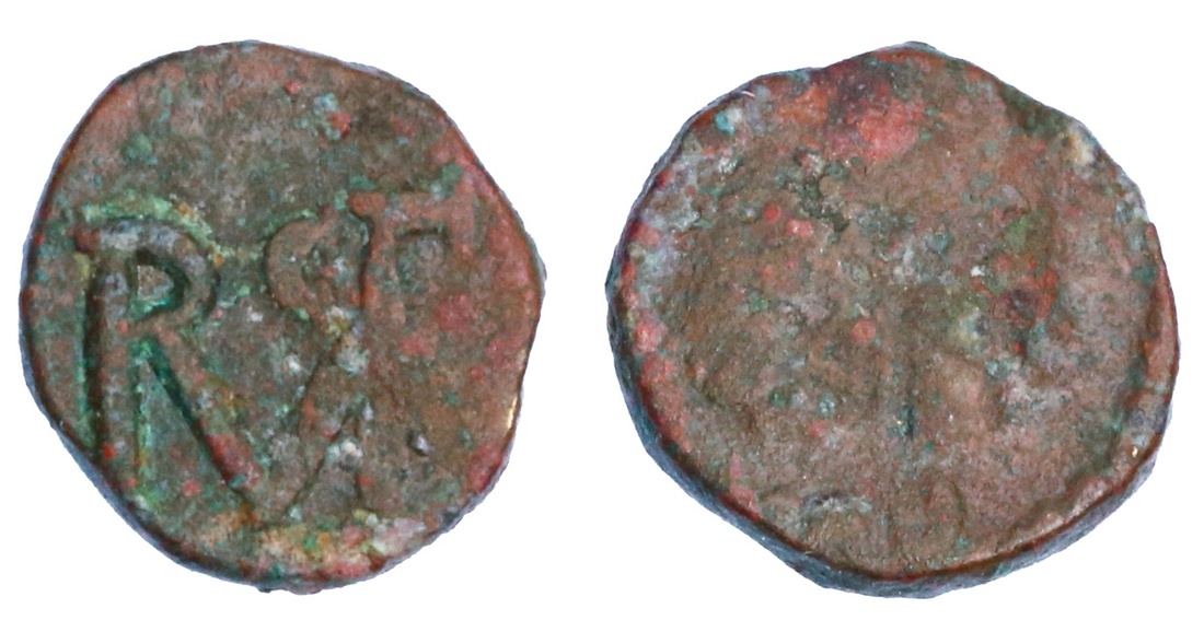 Roman Imperial. Western Empire. Libius Severus (461-465). Issued under Ricimer. AE, 9mm. Rome. 0.90 gms. Crude diademed, draped and cuirassed bust right, rev. Ricimer monogram. RIC 2716. Rare. heavy patina obverse. Fine.