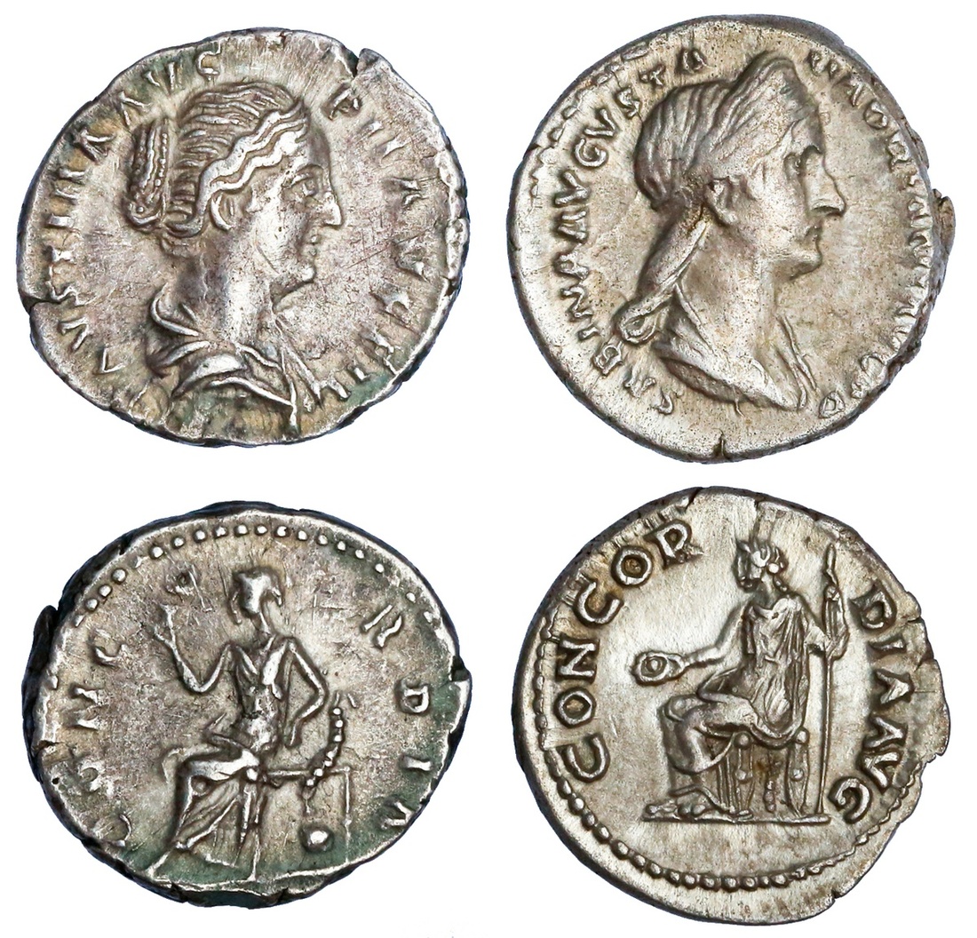 Roman Imperial. Augustae Denarius pair: Sabina (117-136/6) and Faustina, Jr. (147-175). Both with Concordia reverses. RIC 398, 502a (Antoninus). Good Very Fine, Near Extremely Fine. (2)
