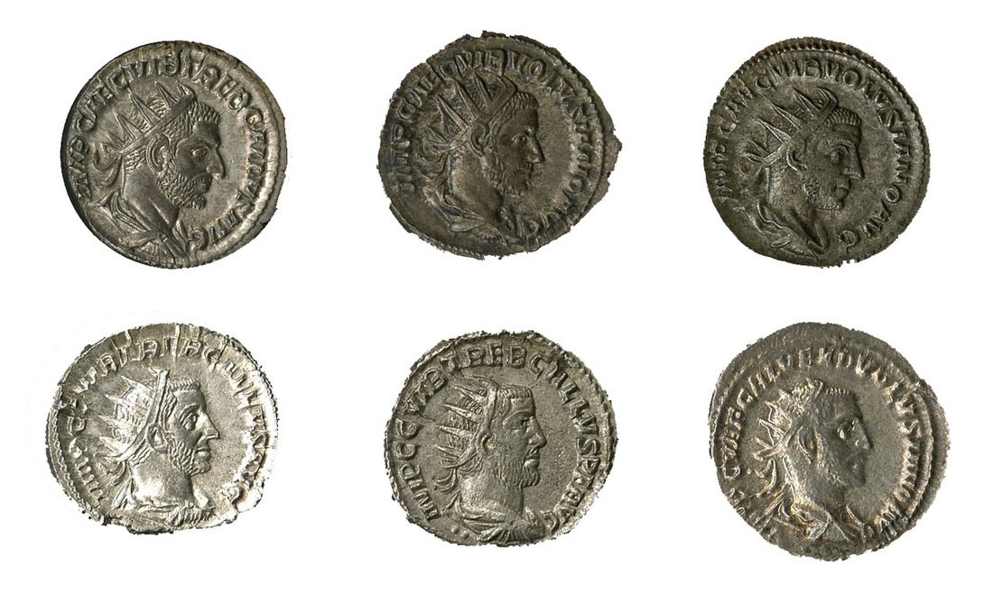 Roman Imperial. Sextet of AR Antoniniani: Trebonianus Gallus (251-253). Mediolanum (Milan). Radiate, draped and cuirassed bust right, rev. Pietas standing left before altar. Extremely Fine; Rome. Rev. Libertas standing left, leaning on column. RIC 39. Near EF; Antioch. Rev. Aequitas standing left. Very Fine. RIC 72, 80; Volusian (251-253). Rome. Rvs. Concordia standing ¾ left; Virtus standing left. Extremely Fine and Very Fine. RIC 167, 186; and Antioch. Rev. Pax standing left. RIC 230a. Very Fine. (6)