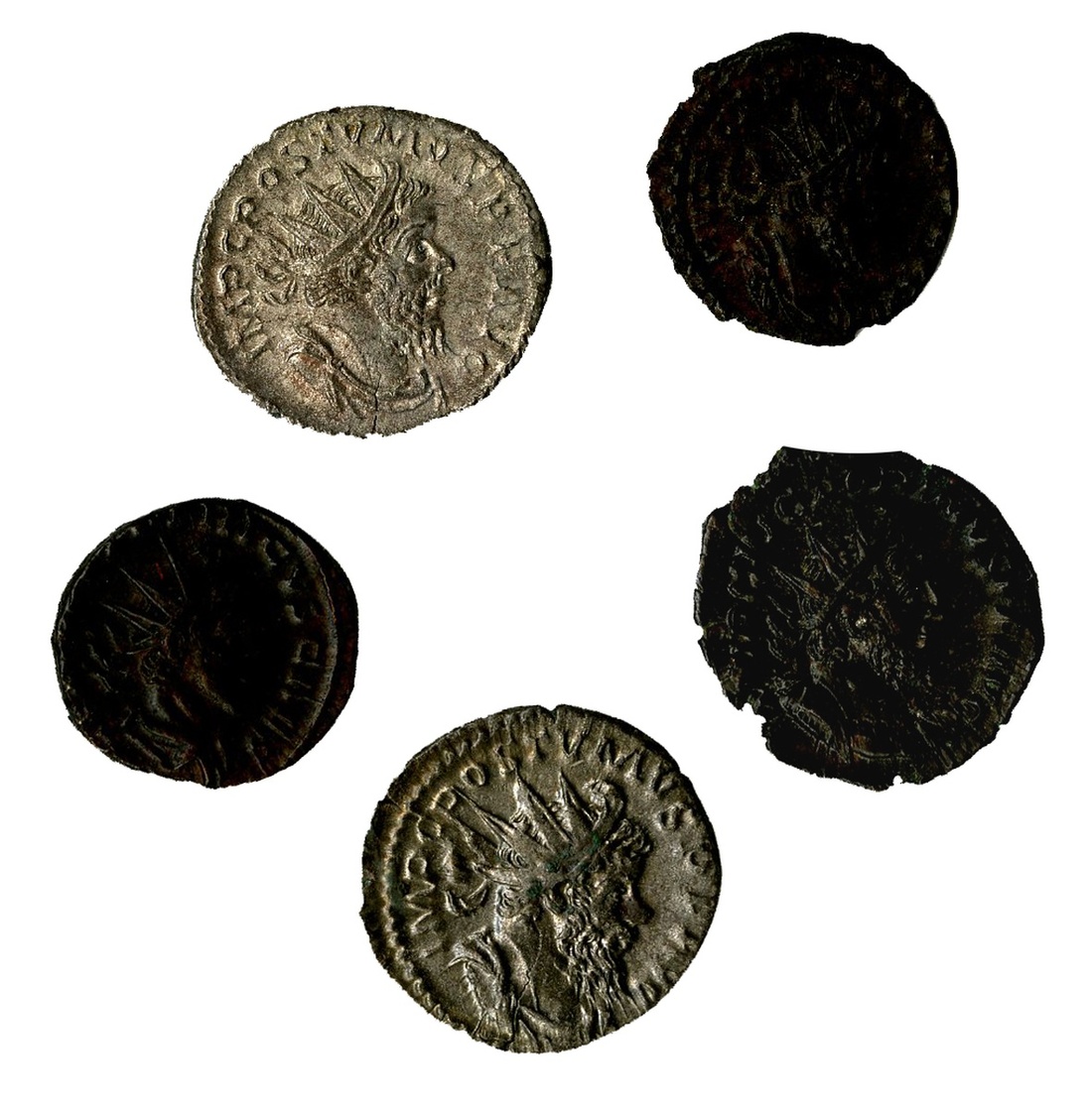 Romano-Gallic Empire. Lot of Billon Antoniniani. Postumus (260-269). Lugdunum. Revs. Emperor left, Felicitas, Fidelitas, Hercules right, Hercules left, Moneta, Providentia, Emperor right, and Victory left. RIC 54, 58, 59, 64, 67 (2), 75, 80, 83. About VF-VF; Victorinus (269-271). Cologne. Rev. Salus standing right. RIC 122 (2); Tetricus I (271-274). Cologne. Rev. Spes advancing left. RIC 136; Tetricus II (273-274). Cologne. Rev. Sacrificial implements. RIC 258; also, Palmyrene Kingdom. Vabalathus, as Augustus (270/1-272). Antioch. Rev. Aurelian bust right. RIC 381; and Roman-British Empire. Allectus (293-296/7). Londinium. Rev. Providentia left. RIC 35. Very Fine. (16)
