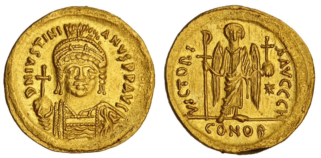 Byzantine Empire. Justinian I (527-565). AV Solidus, struck 545-565. Constantinople, 8th Officina. 4.46 gms. DN IVSTINI-ANVS PP AVG, helmeted and cuirassed bust facing, holding globus cruciger and shield, rev. VICTORI-A AVCCCH, Angel standing facing, holding long staff surmounted by staurogram and globus cruciger, CONOB in ex. DOC 9h, MIB 7, SB 140. Polish mark on edge. Extremely Fine.
