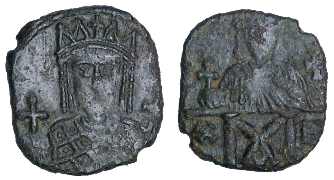 Byzantine Empire. Constantine VI and Irene (780-797). AE Follis. 2.25 gms. Crowned facing bust of irene holding globus cruciger and (scepter), rev. Crowned facing bust of Constantine VI. DOC 7, SB 598. About Very Fine.