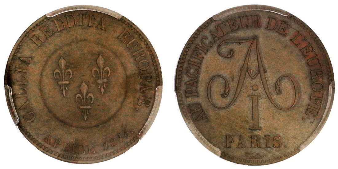 France. First Restoration. Pattern Essai 5 Francs TIOLIER, 1814. In honor of TSAR ALEXANDER I of Russia. By Tiolier. Bronze. Three fleurs de lis on raised globe, rev. Alexander I cipher; AU PACIFICATEUR DE L'EUROPE / PARIS. Maz-766b (R1). PCGS SP 62 BN.