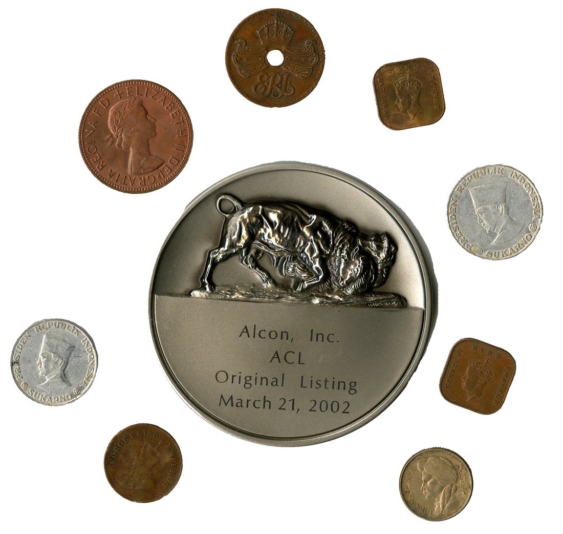 World Potpourri. 19th-20th Century, a few earlier, base metal coinage. Largely South Asia and the Pacific; fair amount of Malaya, large grouping of 1936 New Guinea Pennies, a few from Sarawak, British North Borneo. Good-BU. Total weight 26 lbs; also New York Stock Exchange Medals (7). Nickel(?), 77mm. For "Alcon, Inc. ACL Original Listing, March 21, 2002" and "Closing Bell Ceremony, Dec. 4, 2003".