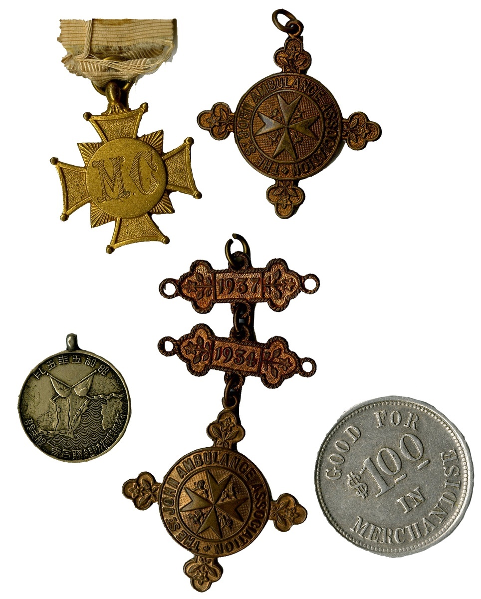 Small lot of Badges and miscellanea. Includes two St. John Ambulance crosses, one of which with 1934, 1937 bars; uncertain "MC" cross on ribbon (separated); Hudson District (NY) Athletic League Award Medal for 1916 100 Lb Relay; small WWII-era Japanese medal; Travis Airforce Base NCO Mess token - GF $1.00 IM; and modern Italian made glass Colt Pattern powder flask. Fine-Extremely Fine. (7)