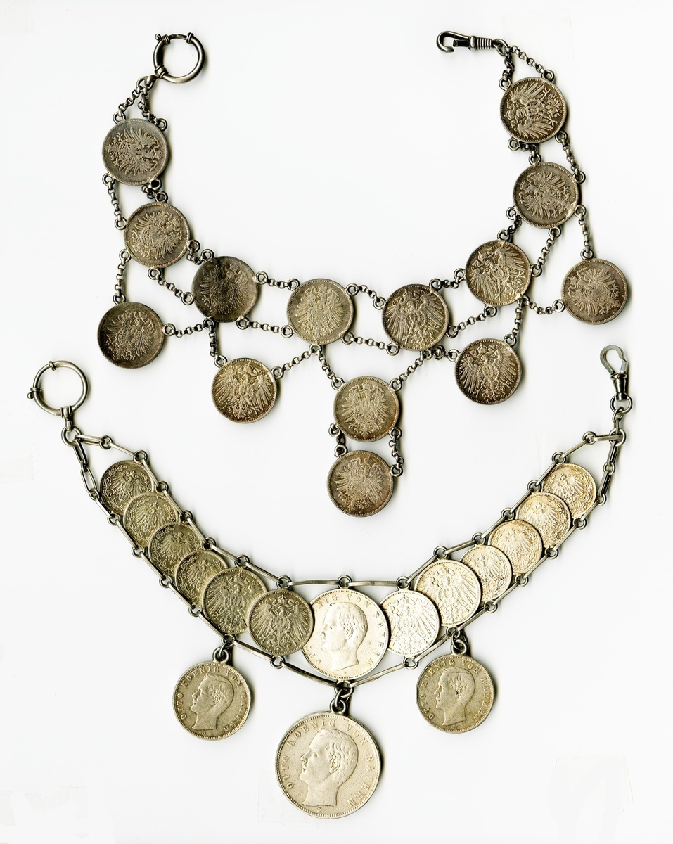 Pair of Silver Chokers set with German Silver coins. One set with Bavarian 1903 5 Mark, 1909 3 Mark, 1905 and 1906 2 Mark; and German ½ marks (8), and Marks (4), early 1900s; the other with German Marks (14), ca. 1875-1915.