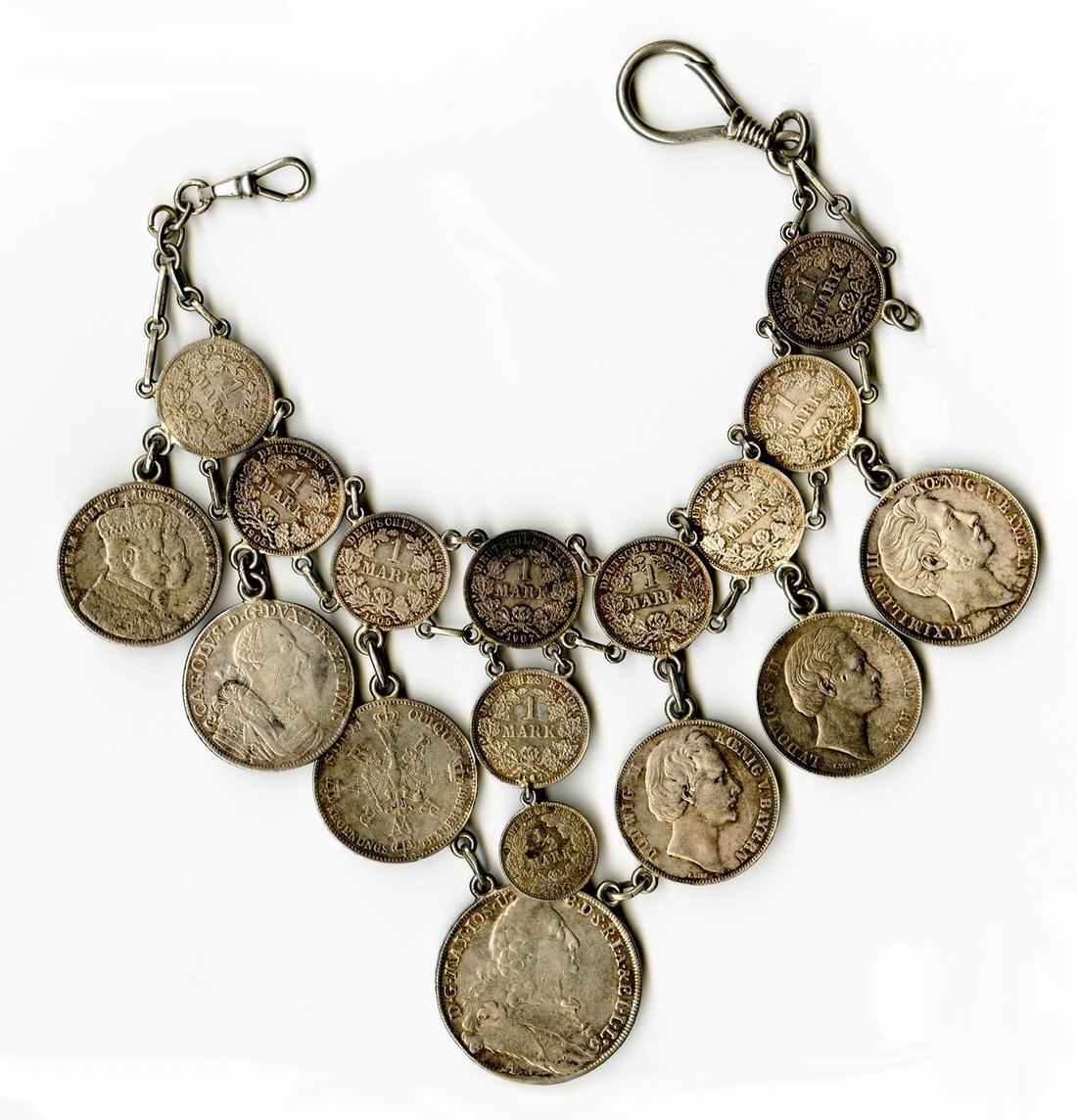 Silver Choker set with German States and Imperial coins. Outer line with Bavarian 2 Gulden, 1855, Madonna Taler, 1870, Victory Taler, 1871, Madonna Taler, 1774; Prussian Coronation Talers, 1861 (2) and Brunswick-Luneberg 2/3 Taler, 1764. The inner line set with 9 Imperial Marks and one ½ Mark.