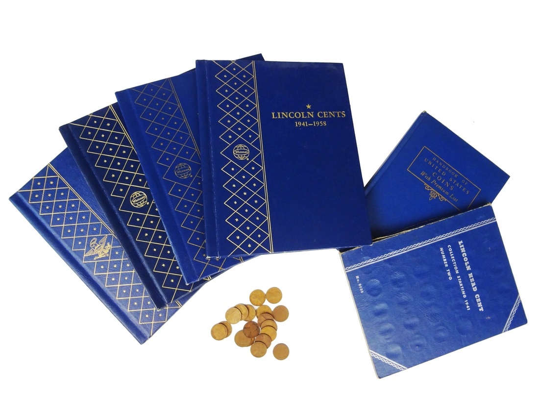 Partial Sets of Lincoln Cents. Mostly in blue Whitman albums. A partial set of Lincoln Cents, 1909-1940 about 50 pieces, mostly different, average circulated. Three partial sets of Lincoln Cents, 1941 through the 1950s and 1960's. Also included are two circulated Buffalo nickels, 12 different clad Washington Quarters in an album, and a fifteenth edition blue book.