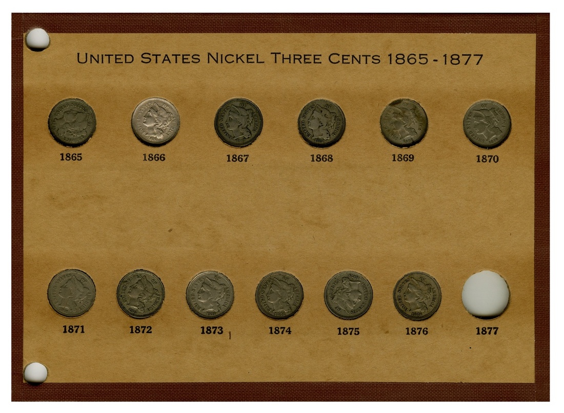 A Pleasing Partial Set of Nickel Three-Cent Pieces in Brown Wayte Raymond Album Pages.1865 Fine; 1866 EF; 1867 VF; 1868 Fine; 1869 EF, some toning; 1870 VF-EF; 1871 VG; 1872 EF; 1873 Open 3 F-VF; 1874 F-VF; 1875 EF; 1876 VF-EF; 1879 VF; 1880 EF; 1881 F-VF; 1889 VF-EF. (16)
