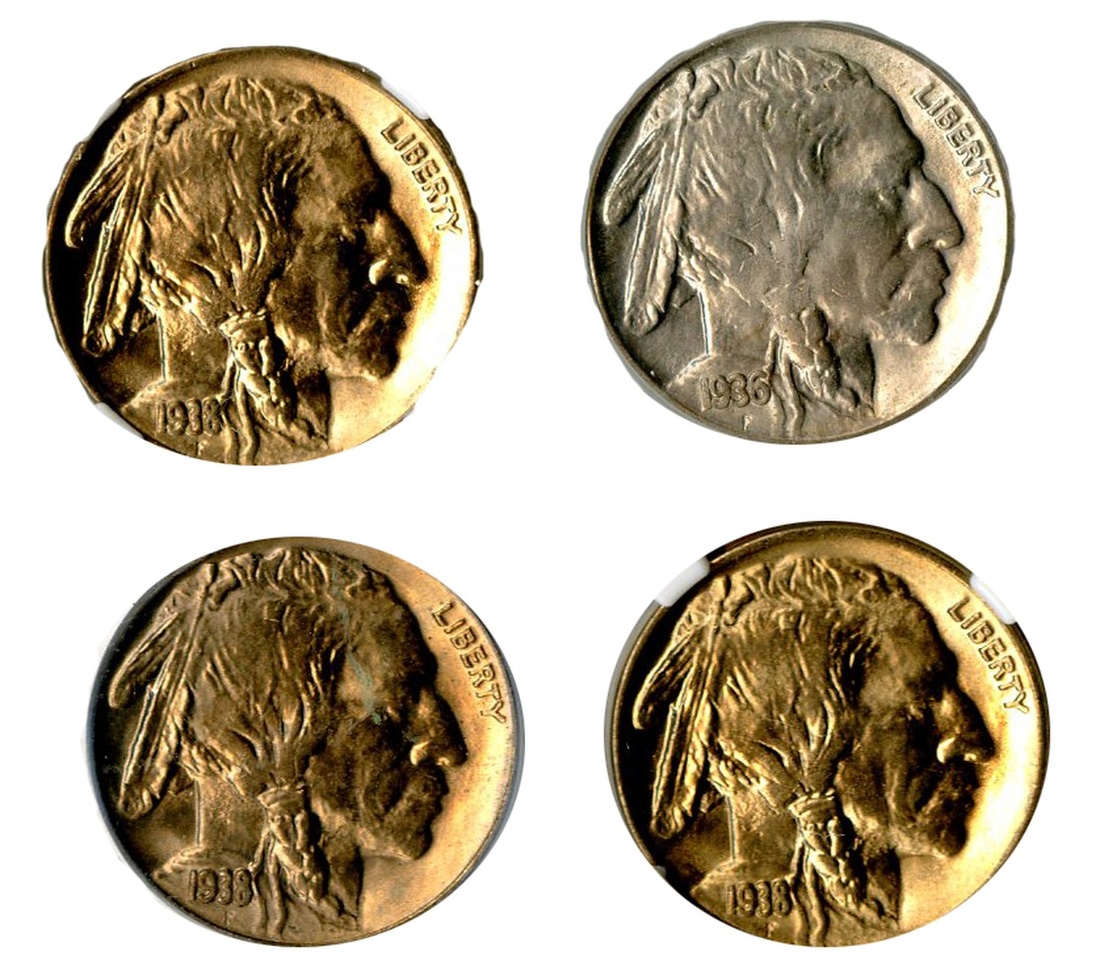 Certified Buffalo Nickel Quartet. 1936-S ICQ MS62;1938-D NGC MS 67; 1938-D PCGS MS65; 1938-D NGC MS 65. [4]