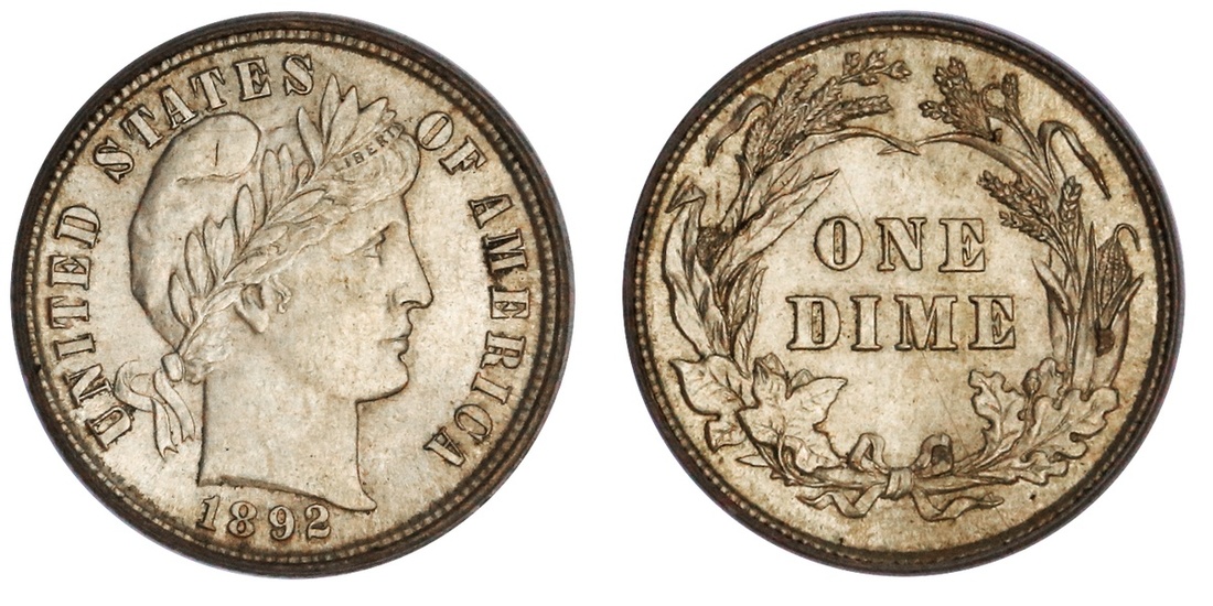 1892 Barber Dime. PCGS MS 63. With full white lustre.
