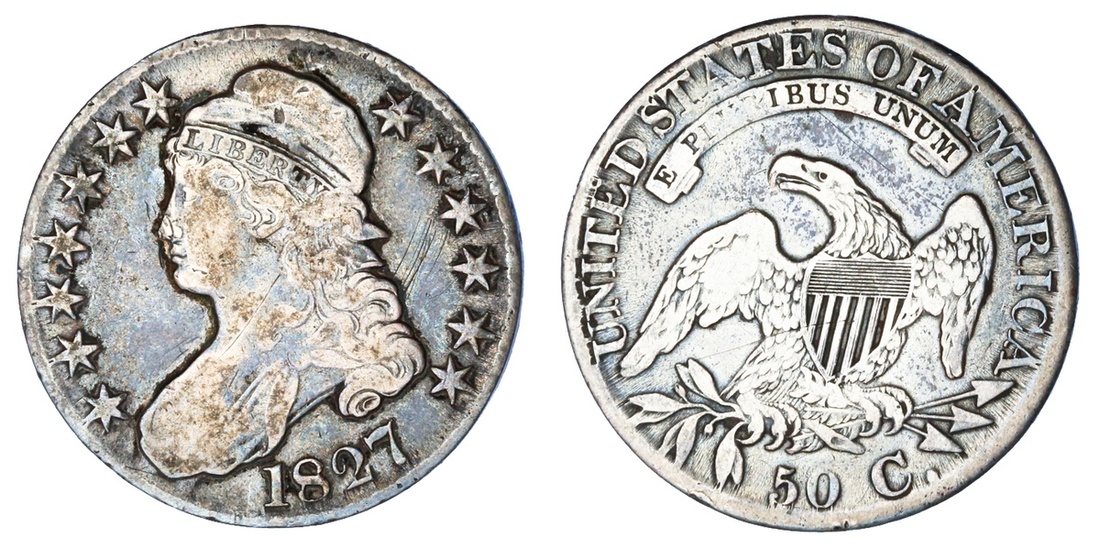 1827 Bust Half Dollar. Fine details. Scratches in the right obverse field.