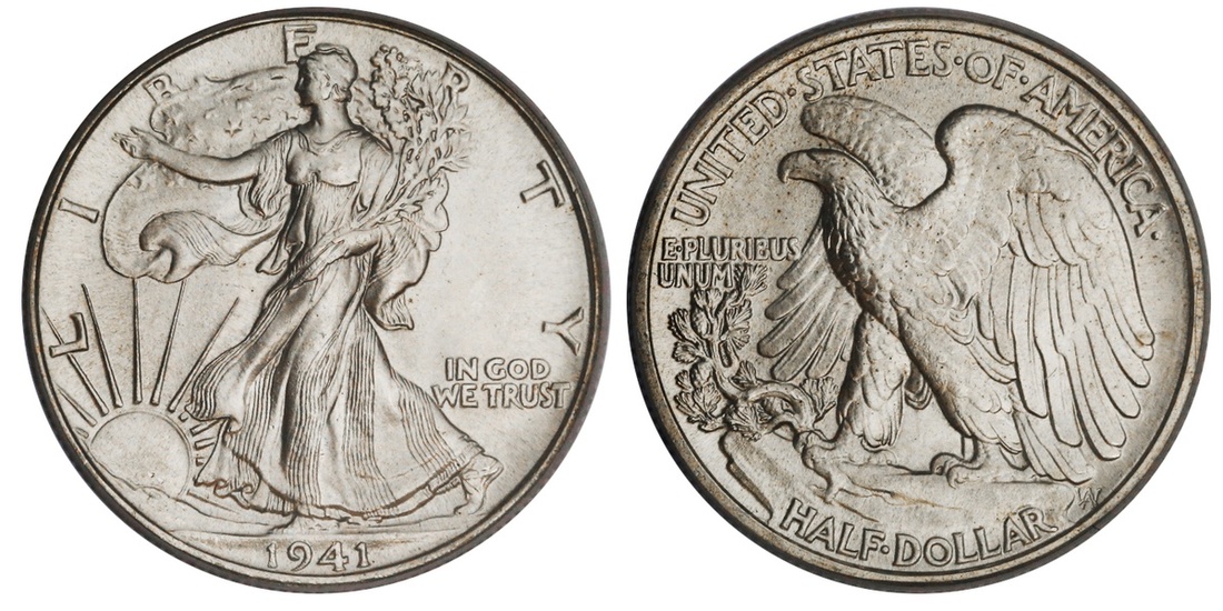 1941 Walking Liberty Half Dollar. PCGS MS66. Full white lustre.