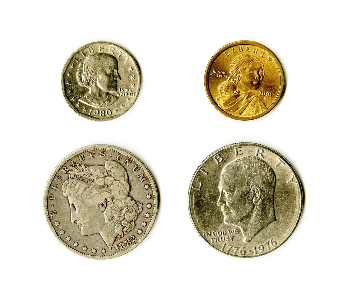 Quintet of Morgan Dollars. 1885, 1900. EF-AU; 1882-O, 1921 (2) average circulated; along with 1976 Commemorative Eisenhower Dollars (11), regular issue Eisenhowers (7), Susan B. Anthonys (14) and AE Dollars (7).