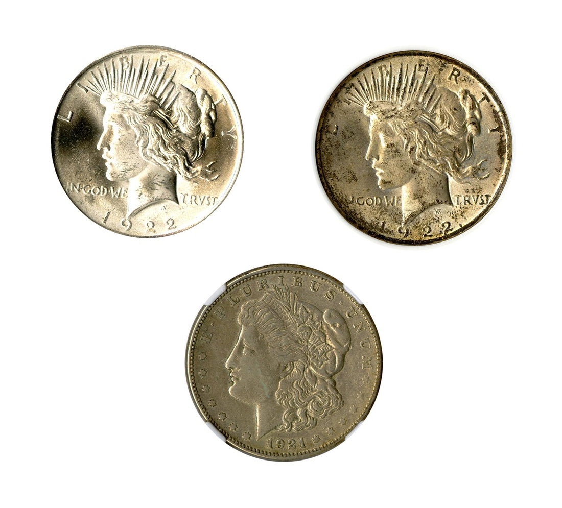 Group of Mostly ANACS Graded Morgan & Peace Dollars. 1878 7F EF 45 Details, cleaned; 1881-O EF 45 Details, rom damaged; 1890-CC PCGS G06; 1891-CC VG 8; 1896 PCGS AU55; 1899-S Fine Details, cleaned; 1921-D EF Details, cleaned; 1921-S NGC AU 50; 1922 MS 65; 1922 PCGS MS64+; 1923 ICCS MS 63. ANACS certified unless otherwise mentioned. (11)