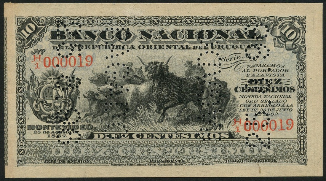 Banco Nacional, Uruguay, 10 centesimos (6), 1887, black on pale blue underprint, cattle stampede at centre, arms at left, one cancelled with perforation, two with SALTO overprint