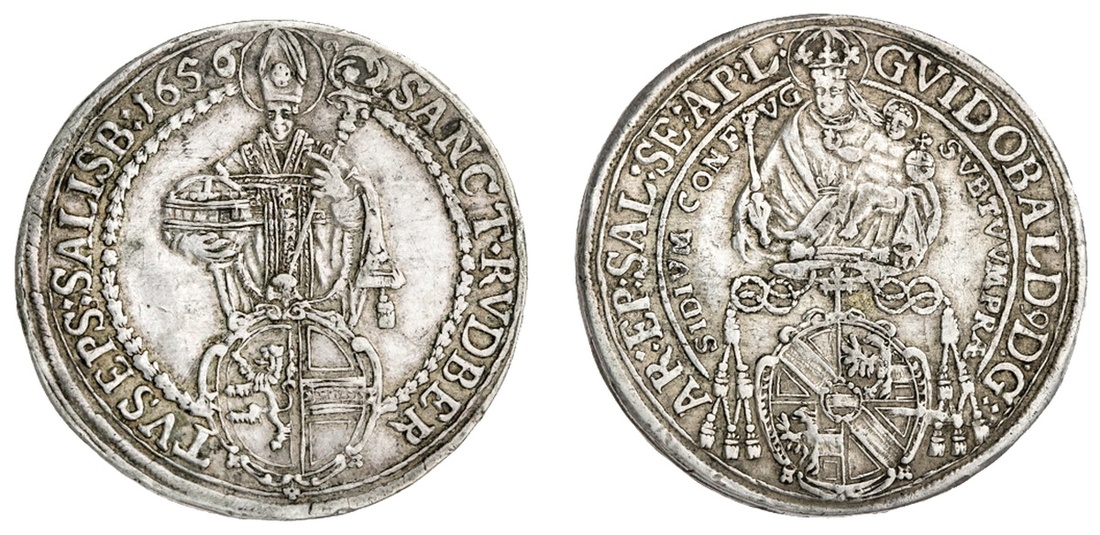 Salzburg. Guidobald v. Thun (1654-1668). Taler, 1656. Madonna and Child above hatted and tasseled Arms, rev. St. Rupert standing facing above oval Arms. Dav.3505, KM 162. Very Fine.