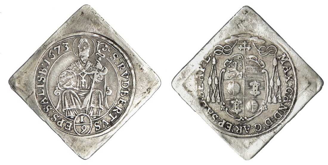 Salzburg. Max Gandolph v. Kuenburg (1668-1687). Klippe 1/9 Taler, 1673. Hatted and tasseled Arms, rev. St. Rupert. KM 214. Some hairlines at corners. Very Fine.