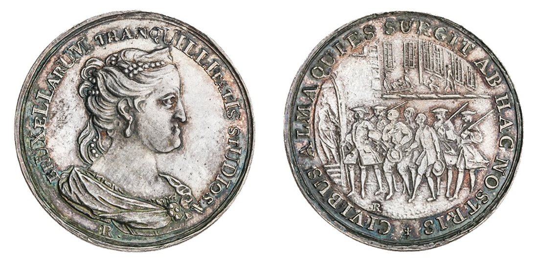 Austrian Netherlands. Charity House and Correctional Home, Brussels 1734. Medal. Silver, 33.7mm. By Roettiers. Draped bust of Maria-Elisabeth right, signed "R" below, Latin legend with chronogram date around ("She is mindful of the peace of Brussels"), rev. Soldiers leading mendicants and reformees to the correctional home; CIVIBUS ALMA QUIES SURGIT AB HAC NOSTRIS, signed "R" below. De Coster 733. Rare. Steely lavender gray with violet and amber hues. Extremely Fine.