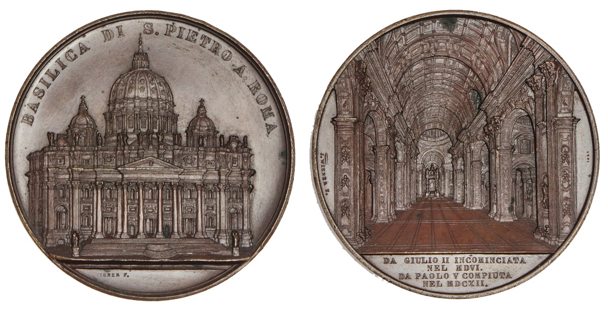 Belgium. Basilica of St. Peter in Rome. Medal (1857). Bronze, 60mm. By Jacques Wiener. View of the Basilica, rev. Interior view. Forrer VI, p.487. A few minute dark areas. Extremely Fine.