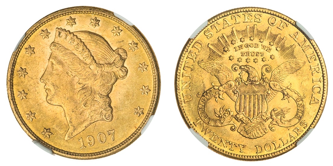 1907 $20 Liberty NGC MS 62. Sharply struck.
