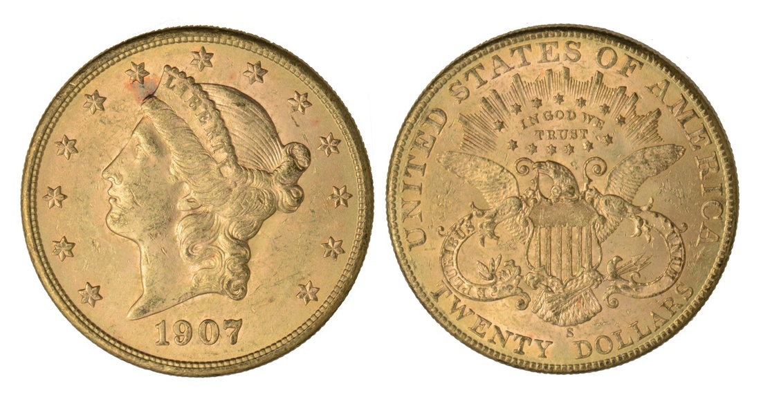 1907-S $20 Liberty. Brilliant Uncirculated.