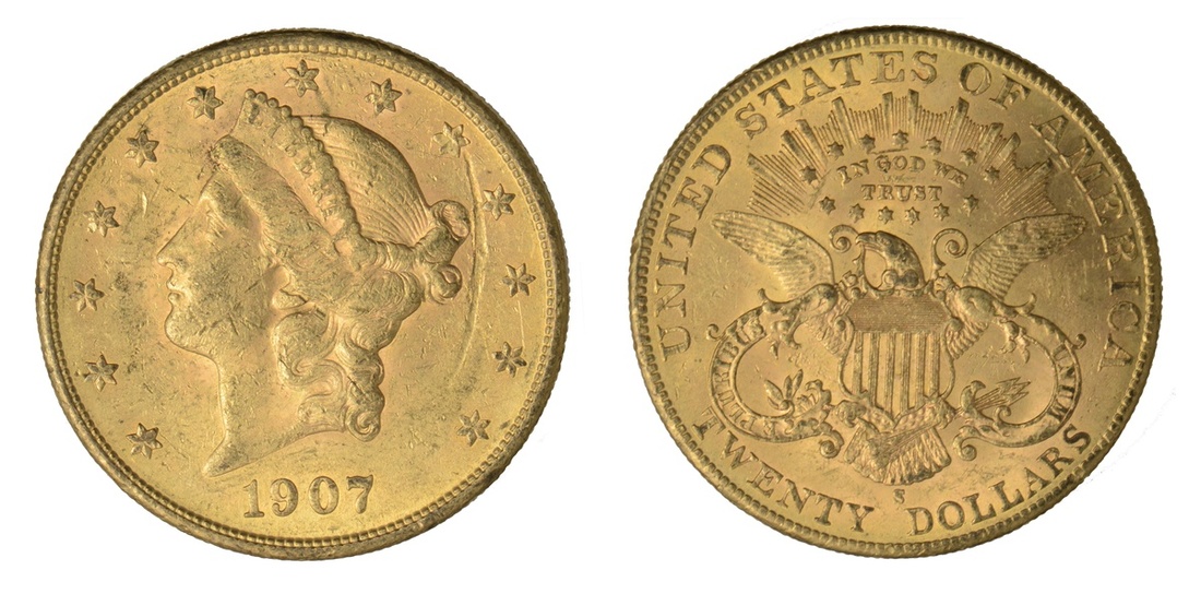1907-S $20 Liberty. Almost Uncirculated.