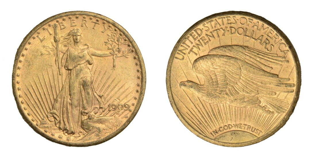 1909-S $20 St. Gaudens. Almost Uncirculated.