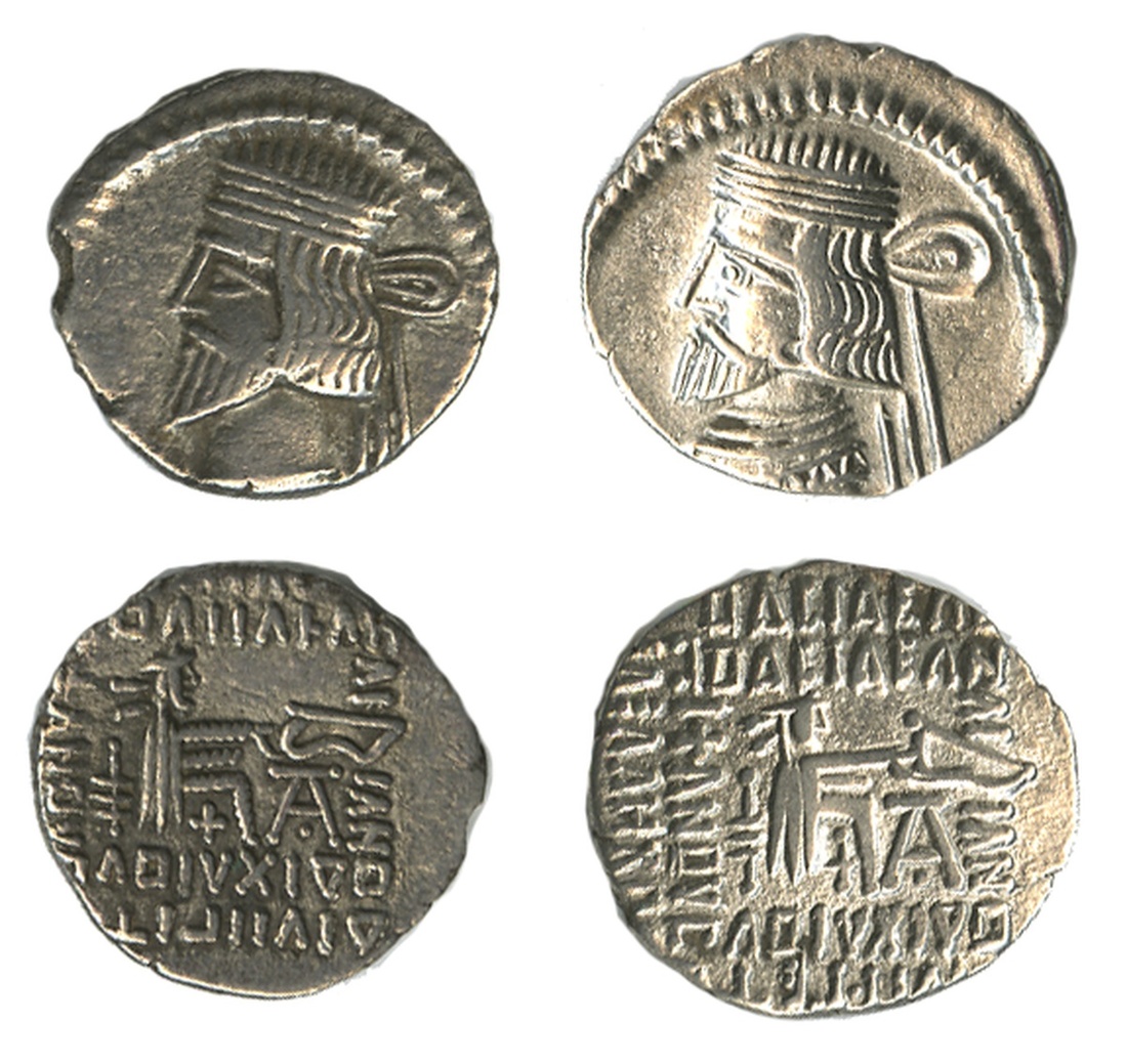 Parthian Hegemony. Pakoros I (ca. 78-105). Pair of AR Drachm. Ekbatana. 3.44 and 3.71 gms. Diademed bust left with medium, pointed beard, wearing earring and torque, rev. Archer (Arsakes) enthroned right holding bow, cross below throne, A monogram before. Sell.78.2 (Vologases III). Very Fine. (2)