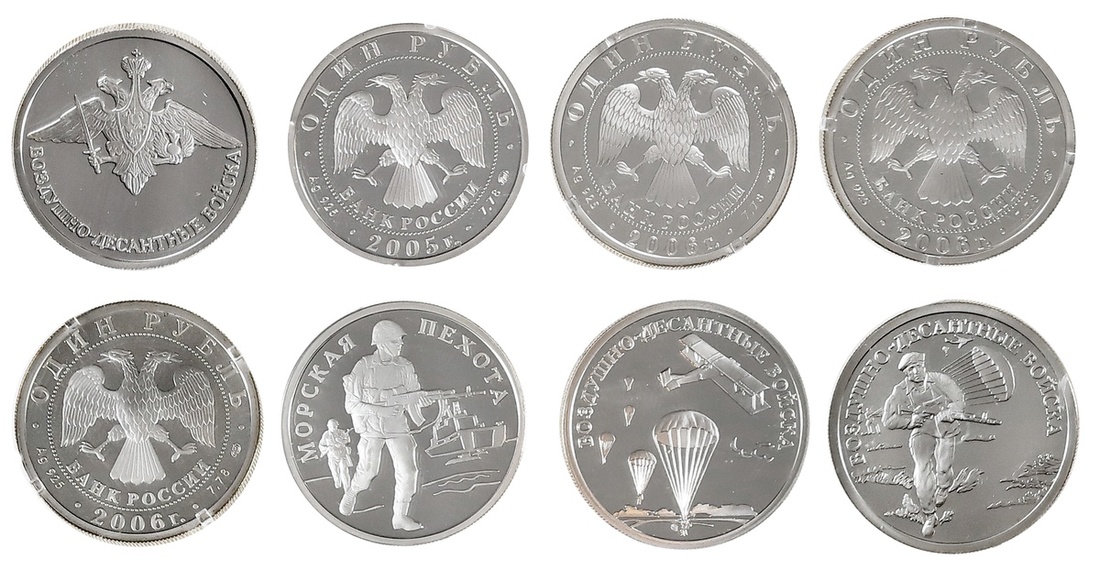 Russia. Federation. Quartet of Proof Silver Rubles. 2005 - Soldiers; 2006 Airborne troops - Commando and paratrooper; Plane and paratrooper; Imperial eagle. Choice Brilliant Proof. (4)