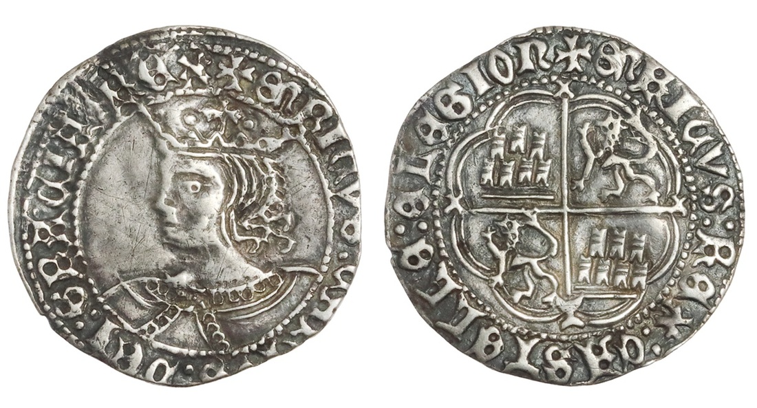 Spain. Castilla y Leon. Enrique IV, el Impotente (1454-1474). AR Real. 3.29 gms. Crowned bust left within circle, rev. Quartered Arms, small X above, symbol below. Light peck marks. About Extremely Fine.