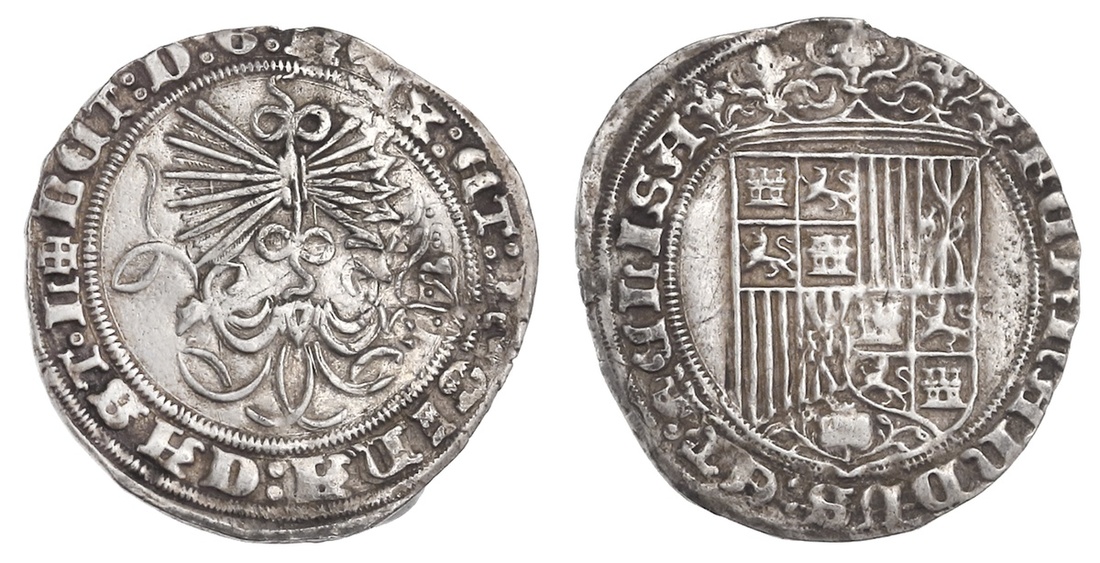 Spain. Reyes Católicos. Fernando y Isabel (1474-1504). AR Real, struck after 1497. Burgos. 3.18 gms. Crowned Arms, rev. Yoke with traces and sheaf of arrows. C&C 2520. Satiny gray. About Extremely Fine.