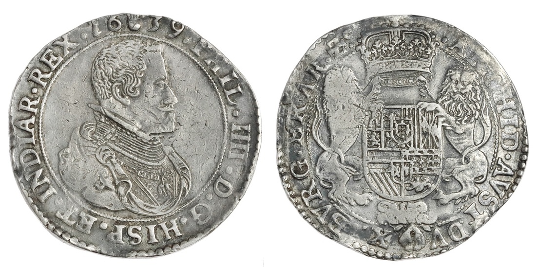 Spanish Netherlands. Brabant. Felipe IV (1621-1665). Ducaton, 1639 (hand). Antwerp. Armored and draped bust right, wearing Order chain, rev. Crowned Arms supported by lions. Dav.4454, KM 71.1. Weakness of strike on reverse. Toned. Very Fine.