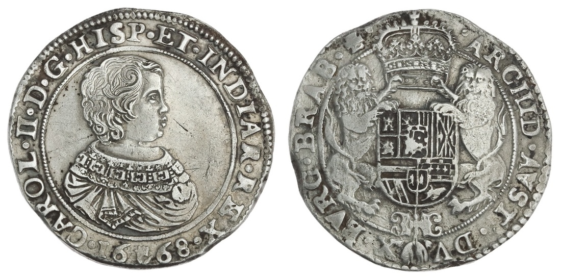 Spanish Netherlands. Brabant. Charles II (1665-1700). Ducaton, 1668 (hand). Antwerp. Draped child's bust right wearing Order collar, rev. Crowned Arms supported by lions. KM 79.1. Once wiped. Lightly toned. Very Fine.