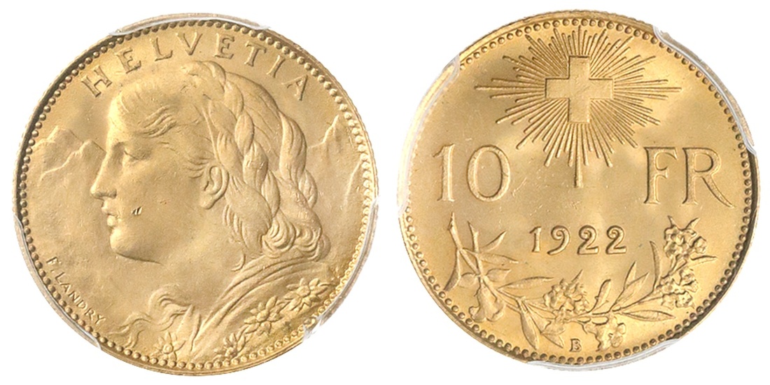 Switzerland. Confederation. 10 Francs, 1922 B. Vreneli designs. KM 36. PCGS MS 65.