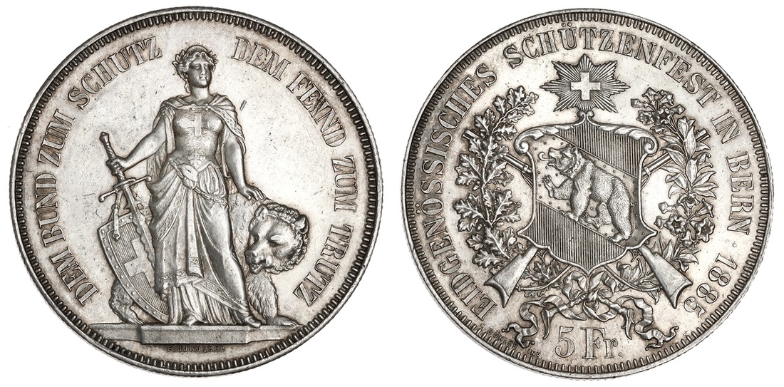 Switzerland. Confederation. Shooting Festival 5 Francs, Bern 1885. Helvetia standing facing, holding longsword and patting bear, rev. Cantonal Arms, crossed rifles behind, within wreath. X S17. Tiny obverse nick. Lightly toned. Uncirculated.